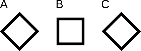 You’re looking down at the table as in (A), seeing a diamond shape. Rotating it 45 degrees clockwise yields a square shape (B), whereas 90 degrees produces the same diamond shape (C). You can repeat this rotation 3 times, for 4 times total.
